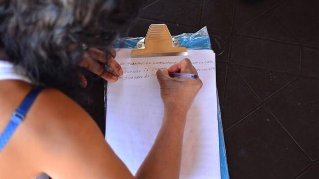 En unas carpas, que tiene la Policía, a la gente que se encuentra en la calle las ponemos hacer unas planas con una frase que dice: “debo cumplir cuarentena y no salir de la casa”.