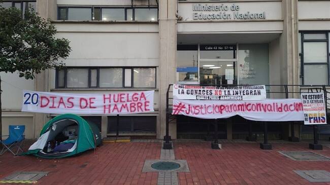 Desde el 12 de enero del 2021 y en medio de carpas y cobijas, el médico santandereano, Juan Pablo Ovalle, quien estudió en el exterior está durmiendo frente al Ministerio de educación, en Bogotá, exigiendo que le den validez a su título de especialización en cirugía Toráxica que realizó fuera del país.