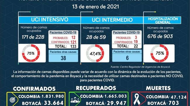 El secretario de Salud de Boyacá, Jairo Santoyo, confirmó el incremento a 171 pacientes en camas de Unidades de Cuidados Intensivos en todo el departamento, lo que representan 75% de ocupación.