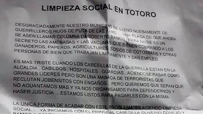 Aunque el volante no hace referencia a algún grupo armado, se atribuye el reciente asesinato de Oliverio Conejo, coordinador del Programa de Salud del Cabildo Indígena de Totoró, y su hija Emily de 22 años, en zona rural del corregimiento de Gabriel López.