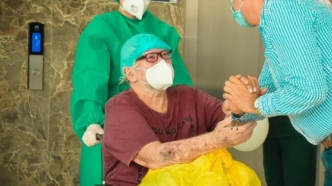 Se trata de Eduardo Gómez, un adulto mayor de 79 años, quien salió de la Clínica Magdalena en Barrancabermeja. Los médicos y enfermeras lo despidieron honrando su vida al recuperarse de COVID-19 con aplausos, música y globos blancos.