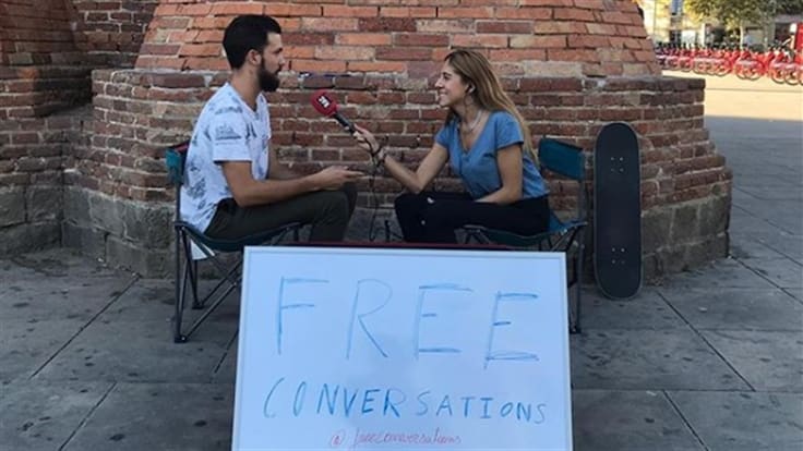 El español de 25 años es un apasionado por la lectura, escritura y, sobretodo, la oratoria. En su tiempo libre toma dos sillas junto a un cartel que dice “Conversaciones gratis” y en la calle escucha y charlar con desconocidos sobre cualquier tema.