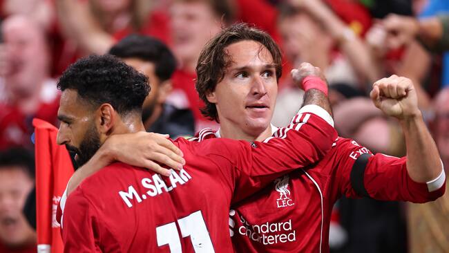 El equipo dirigido por Arne Slot ganó sobre el final con goles de Federico Chiesa y Mohamed Salah para sumar sus primeros tres puntos de la temporada.